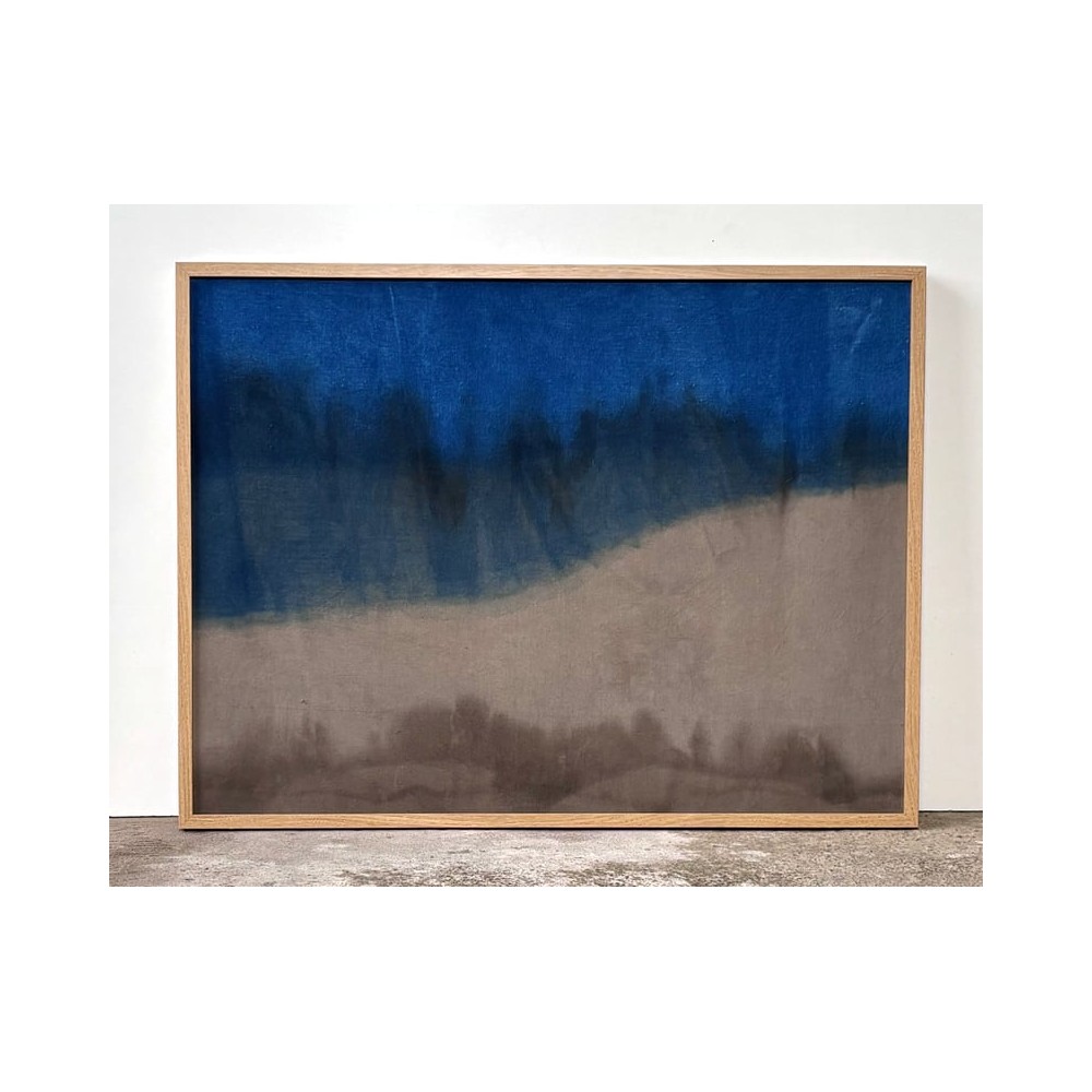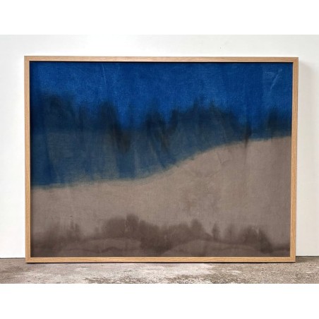 Joël Dagès, Atlantique II, 2025. Índigo, pepitas de uva y lactato de hierro. 80 × 60 cm. Tinte vegetal sobre tela antigua, shibori.