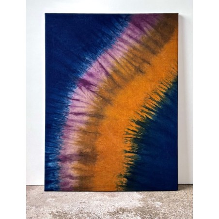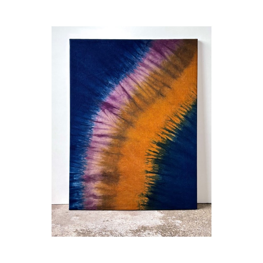 Joël Dagès, Sans titre IX, 2025. Índigo, lac dye, madera de catecú y titanio. 80 × 60 cm. Tinte vegetal sobre tela antigua, shibori.