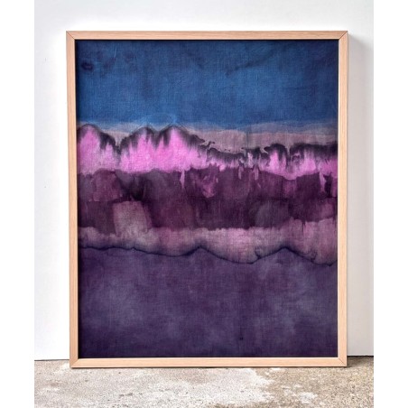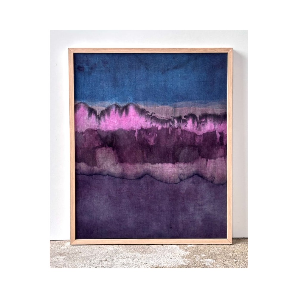Joël Dagès, Sans titre II, 2025. Índigo, lac dye, palo de Campeche y hierro. 62 × 50 cm. Tinte vegetal sobre tela antigua, shibori.