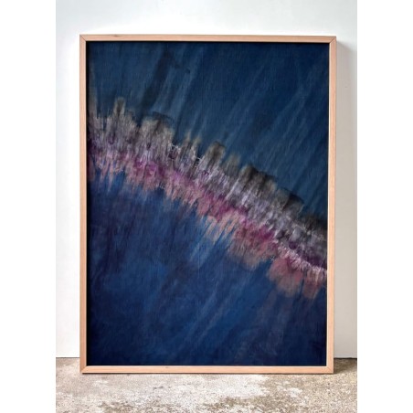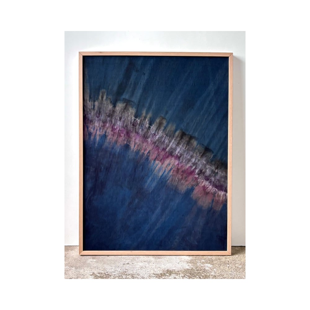 Joël Dagès, Sans titre VI, 2025. Indigo, lac dye & bois de campêche. 80 × 60 cm. Teinture végétale sur tissu ancien, shibori.